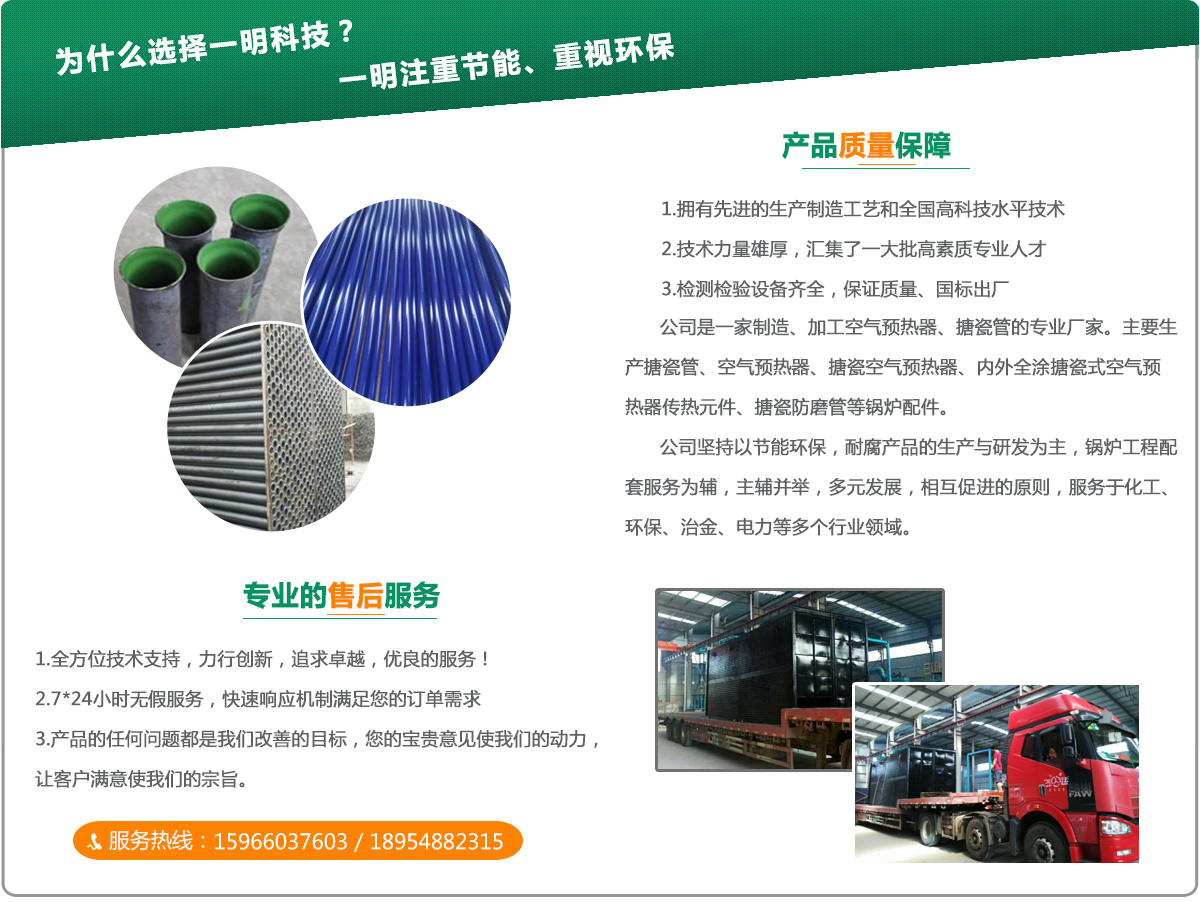 山東一明節能環保設備科技有限公司坐落于山東省肥城市,地處山東中部、泰山西麓,是資源豐富的魯中福地,文明中外的肥桃之鄉。肥城是有名的明星市、綜合實力縣(市)和山東省經濟縣(市)、精神文明建設先進市。肥城有著豐富的歷史文化,古稱“君子之邑”,是史圣左丘明的家鄉,商圣范蠡定居之地。公司是一家制造、加工空氣預熱器、搪瓷管廠家。主要生產搪瓷管、空氣預熱器、搪瓷空氣預熱器、內外全涂搪瓷式空氣預熱器傳熱元件、搪瓷防磨管等鍋爐配件。公司堅持以節能環保,耐腐產品(空氣預熱器、搪瓷管、管箱)的生產與研發為主,鍋爐工程配套服務為輔,主輔并舉,多元發展,相互促進的原則,服務于化工、環保、治金、電力等多個行業領域。是專門為電力、石化、紡織、印染等行業開發、設計、制造傳熱元件及配套設備的生產廠家;公司技術力量強大,匯集了一大批高素質的人才,擁有先進的生產制造工藝和高水平的技術設備。公司展望未來,我們謹持“質量、誠...